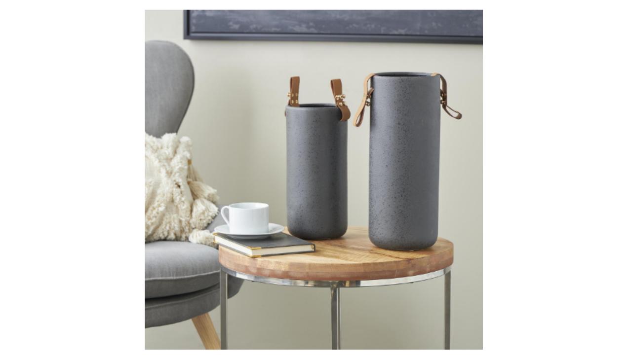 JARRONES CON UN ESTILO QUE RESALTA DISEÑOS AUDACES CON LINEAS ELEGANTES, ELEMENTOS NEUTRALES Y UNA ESTETICA MINIMALISTA. ESTÁ HEHO DE MATERIAL DE GRES MACIZO, METAL Y CORREAS DE PIEL SINTÉTICA.