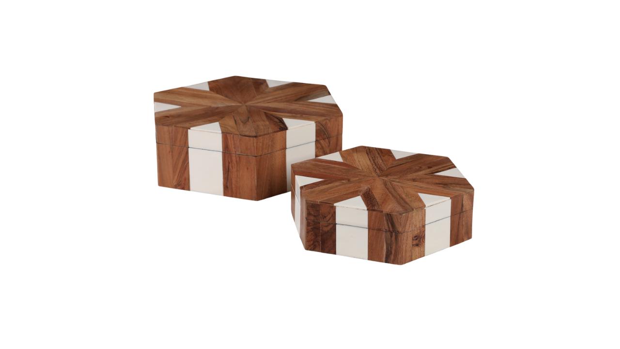 S/2 CAJAS HEXAGONALES CON INCRUSTACIONES DE MADERA DE 10/12", NATURAL/BLANCO